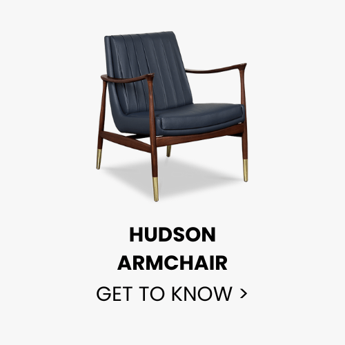 This sitting room, located adjacent to the open kitchen, was visually separated by Regan Baker using a custom sectional and area rug. A sleek armchair positioned diagonally creates a balanced composition.